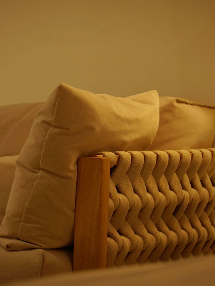 2、沙发作为客厅的主角,采用原木和棉麻的搭配,再加上手作的编织条纹,温馨又充满设计感。
