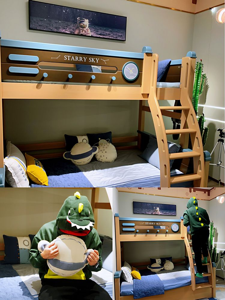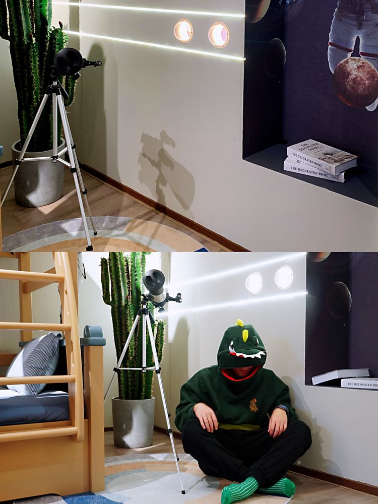 步入门店,“小恐龙”就被太空主题的上下铺房间所吸引,躺在上面,抱着“星球”抱枕,幻想自己就是宇航员。透过单筒望远镜,看着他的“故乡”,梦里成为一位异星旅人,仰望星空,呢喃梦语。